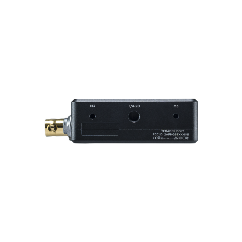 | Specs | Technical Specifications: #Video – Video Inputs : 1 x SD/HD/3G-SDI (75 Ohm BNC) 1 x Type A receptacle HDMI – Sdi Compliance : N/A – Video Outputs : 1 x HD/SD/3G-SDI Loop-out (75 Ohm BNC) – Sdi Ancillary Data Support : supports metadata, timecode, and start/stop flags from certain camera manufacturers. Please refer to: https://support.teradek.com/hc/en-us/articles/217446087 – Color Sampling : SDI: YCbCr 4:2:2, 8-bit HDMI: RGB 4:4:4, 8-bit – Input Cross Conversion : N/A – Delay Tx To Rx : <0.001sec (without format conversion) #Bonding – Bonding : N/A #Supported Resolutions – Supported Resolutions : 1080p 23.98/24/25/29.97/30/50/59.94/60 1080psf23.98/24/25/29.97/30 1080i50/59.94/60 720p50/59.94/60 480p59.94/576p50 (via HDMI ports only) 480i(NTSC)/576i(PAL) #Video Processing – Video Compression : visually lossless – Supported Video Bitrate : N/A – Supported Video Bitrate Details : N/A – Supported Output Resolutions169 : N/A – Test Pattern Generator Support : N/A – Video Format Conversion Support : Yes – Color Correction : N/A #Protocol Support – Network Protocols : N/A – Supported Video Transport Protocols : N/A – Remote Control : N/A – Software Or Platform Integration : N/A #Audio Processing – Audio Format : 48kHz 24-bit PCM – Supported Audio Bitrate Details : N/A #Inputs – Audio Input : Embedded Audio Input #Outputs – Audio Output : N/A #Physical – Dimensions : 0.95", x 2.6" x 4.47", (24mm x 66mm x 101.5mm) – Weight : 8oz (226g) – Construction : Milled Aluminum(Chassis) and regulation-compliant PCB Plastic Cap – Mountability : Multiple mounting options with M3 and 1/4", holes 3/8" ARRI style accessory mount #Interfaces – Http : None – Configuration Interfaces : None – Switches : N/A – Recording Storage : N/A – Mobile App : N/A – Desktop App : Feature-rich Bolt Manager Application for OSX & Windows – Usb Interface Functionality : Upgrade via Mini-USB – External Control : N/A – Bluetooth : N/A #Network – Ethernet : N/A – Antennas : N/A – Wireless : Non-DFS Frequencies: US: 5.19 ~ 5.23 GHz and 5.755 ~ 5.795 GHz EU & JP: 5.19 ~ 5.23 GHz DFS Frequencies: US: 5.27 ~ 5.55 GHz and 5.67 GHz EU & JP: 5.27 ~ 5.67 GHz – Number Of Channels : N/A – Channel Bandwidth : 12x 40MHz wide channels – Usb : N/A – Rf Channel Selection : Auto and Configurable Channel selection – Encryption : AES-128 – Rf Power : 19 dbm EIRP (with two 2dbi antennas) – Rf Sensitivity : N/A – Range : Up to 1000 ft line of sight – Unicast Multicast : Unicast/Multicast – Noise Rejection : Can coexist with WiFi and 5GHz cordless phones #Power – Power Input : 2-Pin Connector 7-28 VDC – Power Output : N/A – Battery : None – Battery Runtime : N/A – Nominal Power Consumption : 7.5 Watts (Measured at 1080p60) – Auxilary Power Input : N/A #Environmental – Operating Temperature : 0 ~ 40 deg-C – Humidity : N/A |