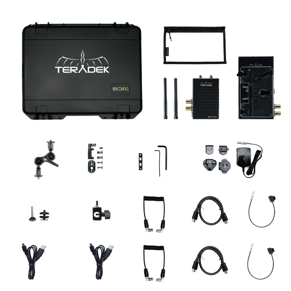 | In the box | Comes with a 1 Bolt transmitter, 1 Bolt receiver, 1 Wooden Camera ultra arm, 1 NATO lock kit and a military-grade Protective SKB Case that fits everything in custom foam. 1 x Protective SKB Case – military-standard waterproof hard case with custom foam (13.5in x 9.5in x 6.5in – 34.29cm x 24.13cm x 16.51cm) 1 x Wooden Camera Ultra Arm Mini Monitor Mount (1/4-20 to 1/4-20) with Arm Ball (3/8-16) 1 x Wooden Camera NATO Lock Kit 1 x Teradek Vinyl Zipper Bag 250x150mm 1 x Hex L Key 2.5 mm size 3-5/6 inch length 1 x Hex L key 3/16inch x 2 13/16inch length 1 x factory-installed Gold Mount (female) Battery Plate 14.4V attached to RX Transmitter 1 x 2-pin Connector to PowerTap 18 inch Cable 1 x Hot Shoe Adapter (1/4"-20 inch) 2 x Antenna 2dBi WiFi 2.4/5.8 GHz 1 x USB 2.0 Cable (A-Male to Mini-B) 1 x HDMI 18in Cable (Type A to Type A) 1 x SDI (BNC to BNC) Cable 10 inch Receiver 1 x Lightstand Adapter (1/4"-20 inch) 1 x USB 2.0 Cable (A-Male to Mini-B) 1 x PSU 2-Pin Connector to 18W AC Adapter 6ft cable 1 x HDMI 18in Cable (Type A to Type A) 1 x SDI (BNC to BNC) Cable 10 inch |